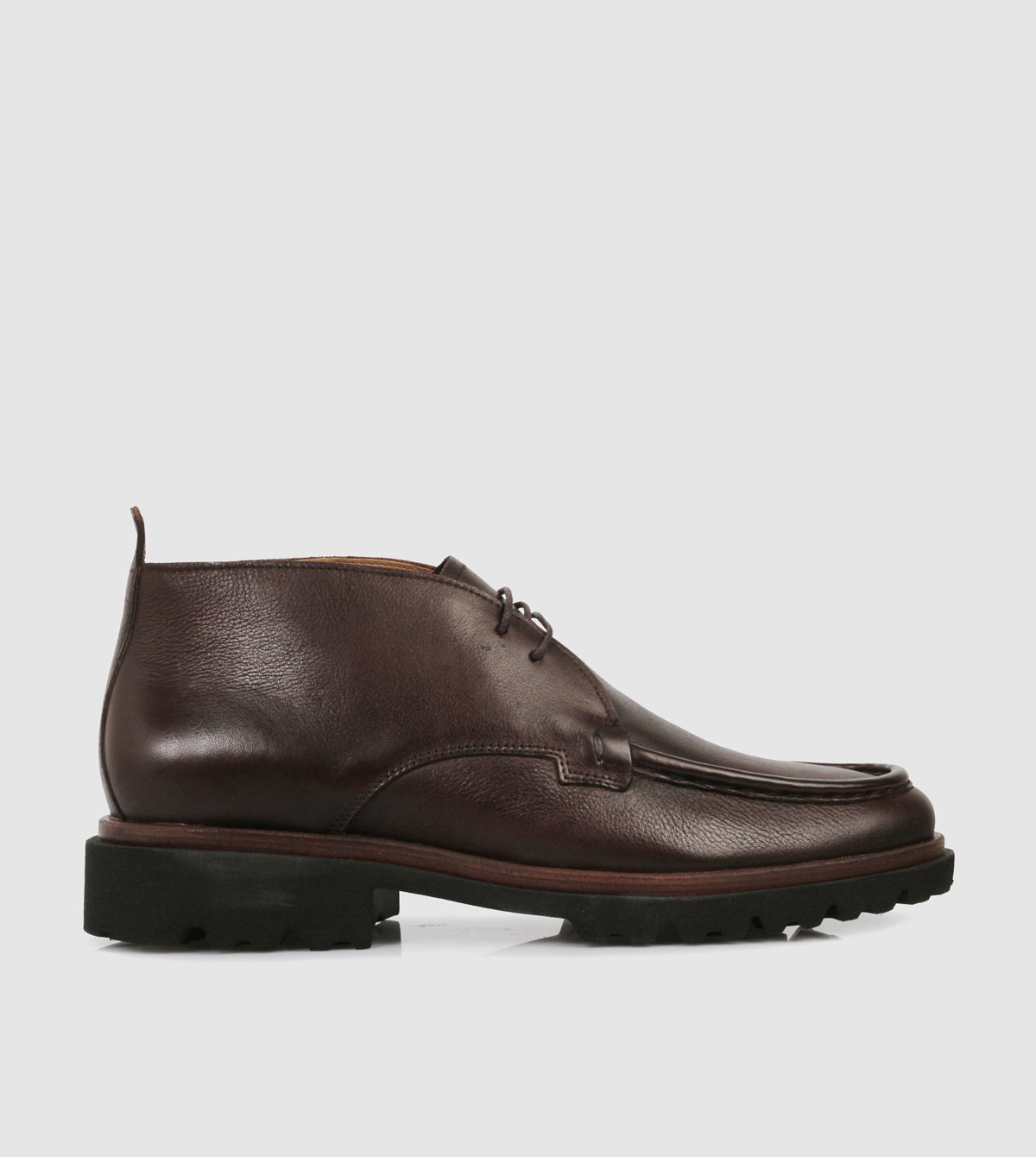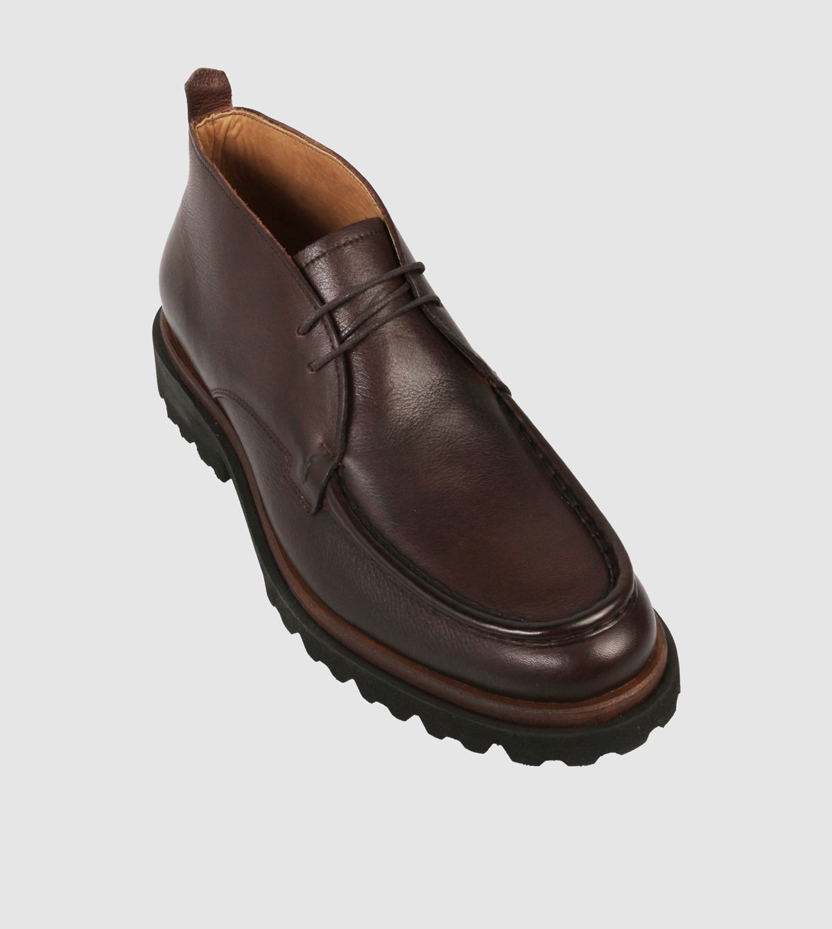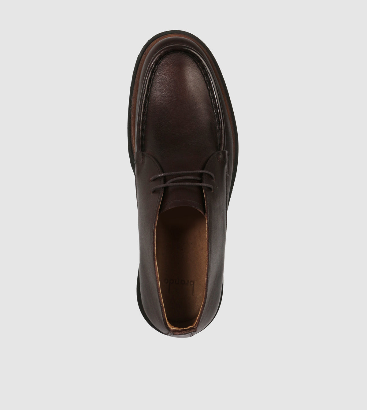 The Luz Casual Loafers by Brando offer a rugged yet refined take on the classic chukka silhouette, balancing heritage utility with contemporary flair. Made from smooth leather, these boots feature a rich dark chocolate tone and a distinct moc-toe stitched apron that adds architectural interest to the upper. Anchored by a heavy-duty lugged rubber sole and a contrasting welt, they provide a commanding profile and exceptional durability for all-terrain city wear.